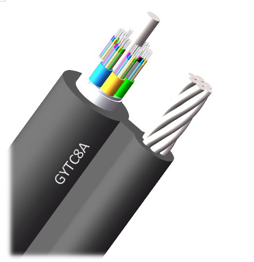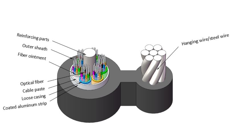 Конструкция оптического кабеля заключается во введении одномодовых или многомодовых оптических волокон в свободную трубку из высокомодульного пластика, заполненную водонепроницаемым компаундом. Центром сердечника кабеля является металлический армирующий элемент. Для некоторых оптических кабелей с определенным количеством жил конструкция оптического кабеля заключается во введении одномодовых или многомодовых оптических волокон в свободную трубку из высокомодульного пластика, заполненную водонепроницаемым компаундом. Экструдируется и оборачивается вокруг металлической центральной армирующей части полиэтиленовый амортизационный слой. Свободные трубки (и заполняющие тросы) скручиваются вокруг центральной армирующей части, образуя компактный и круглый сердечник кабеля. Промежутки внутри сердечника кабеля заполняются водоотталкивающим компаундом. Снаружи экструдируется и оборачивается алюминиево-полиэтиленовая склеенная оболочка, а также добавляются стальные прядевые подвески для формирования кабеля.
