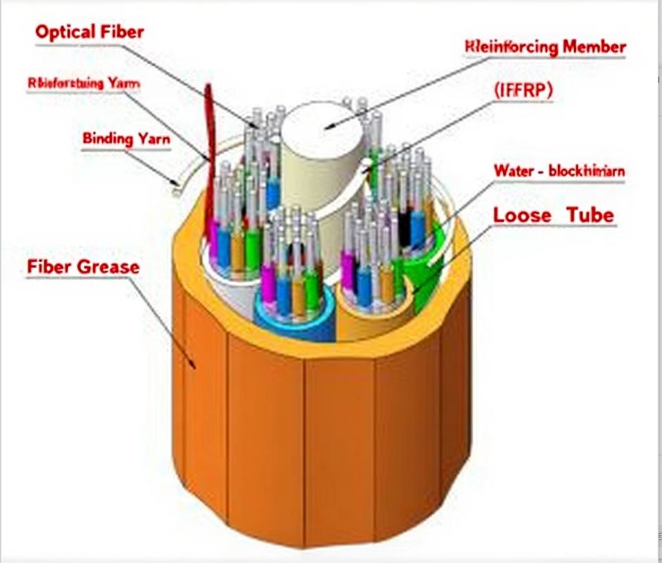 [Неметаллический армирующий элемент, свободный трубчатый слой, скрученная полусухая набивка, нейлоновый оболочечный оптический кабель для наружной прокладки методом воздушного обдува] Конструкция оптического кабеля заключается в размещении одномодовых или многомодовых оптических волокон в свободном трубчатом слое из высокомодульного пластика, заполненном водонепроницаемым компаундом. Центром сердечника кабеля является неметаллический армирующий элемент. Для некоторых оптических кабелей с определенным количеством жил металлический центральный армирующий элемент экструдируется со слоем полиэтиленового амортизирующего слоя, а свободный трубчатый слой (и заполняющий шнур) скручивается вокруг центрального армирующего элемента, образуя компактный и круглый сердечник кабеля. Водостойкая пряжа укладывается в зазоры внутри сердечника кабеля, а нейлоновая оболочка экструдируется для формирования кабеля.